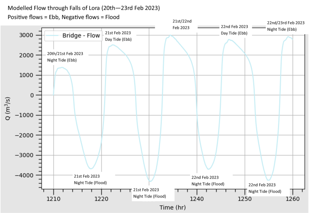 From the graph of modelled flow through the Falls of Lora the observant among you will notice that the peak flow during the flood tide (negative flow values) are around 4000m3/s whereas the peak flow during the ebb tide (positive flow values) are only around 3000m3/s. At first glance this may seem strange as if there were higher flows going into the loch that were coming out of the loch then the water level in the loch would keep rising. However, looking at it closer you will see that the duration of the highest flows during the flood tide occur for a shorter period of time than the highest flows during the ebb tide. This means that although the peak flow is higher during the flood, the total volume passing through the Falls of Lora is equal in both directions.